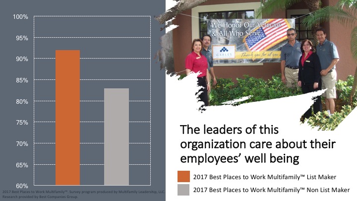 Amongst those that made the list of the Best Places to Work Multifamily™ 92% agree that the leaders of this organization care about their employees’ well being.