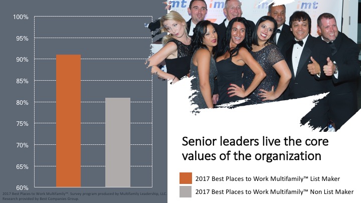 Amongst those that made the list of the Best Places to Work Multifamily™ 91% agree that the senior leaders live the core values of the organization.