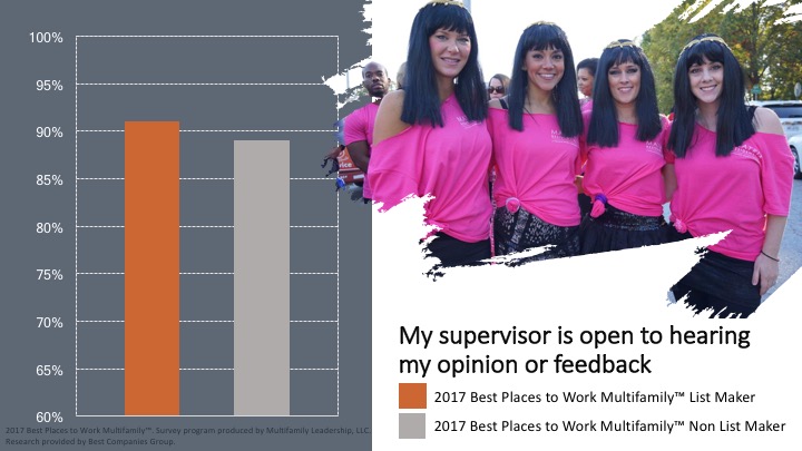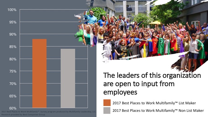 Amongst those that made the list of the Best Places to Work Multifamily™ 88% agree that the leaders of this organization are open to input from employees.