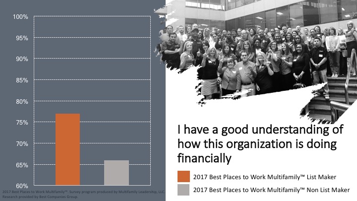 Amongst those that made the list of the Best Places to Work Multifamily™ 77% have a good understanding of how their organization is doing financially.