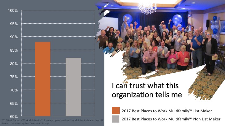 Amongst those that made the list of the Best Places to Work Multifamily™ 88% can trust what their organization tells them.