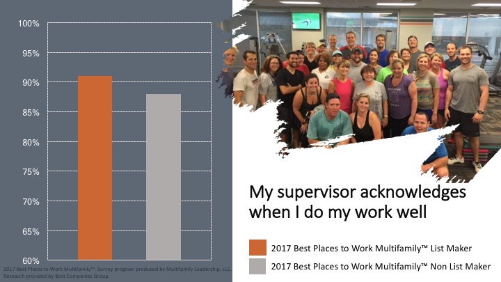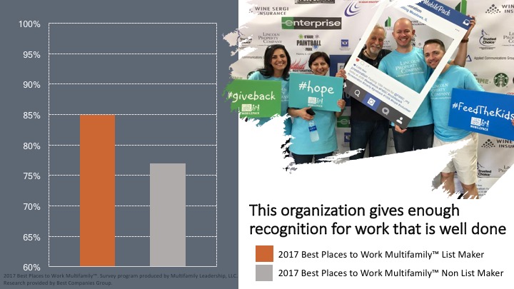Amongst those that made the list of the Best Places to Work Multifamily™ 85% believe their organization gives them enough recognition for work that is well done.