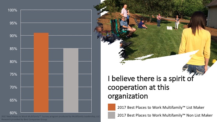 Amongst those that made the list of the Best Places to Work Multifamily™ 91% believe there is a spirit of cooperation at their organization.