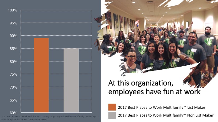 Amongst those that made the list of the Best Places to Work Multifamily™ 89% believe employees have fun at work in their organization.
