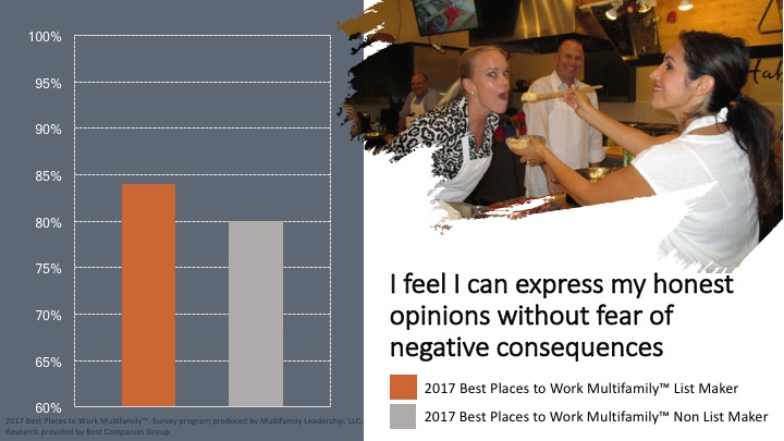 Amongst those that made the list of the Best Places to Work Multifamily™ 84% feel they can express their honest opinions without fear of negative consequences.