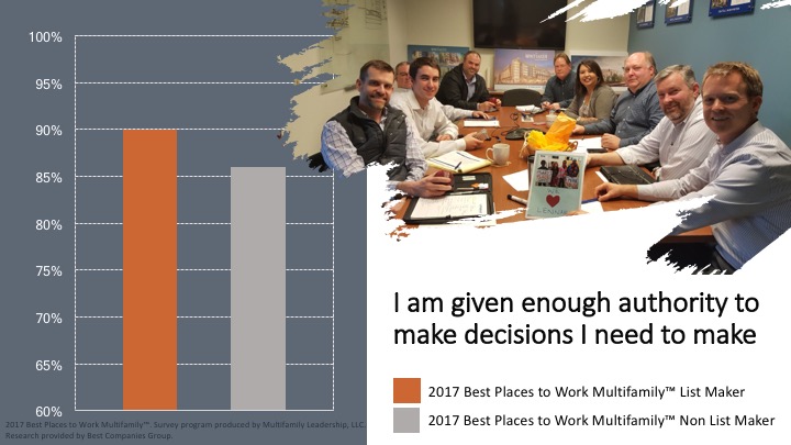 Amongst those that made the list of the Best Places to Work Multifamily™ 90% are given enough authority to make decisions they need to make.
