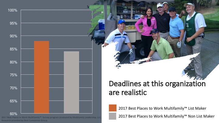 Amongst those that made the list of the Best Places to Work Multifamily™ 89% agree deadlines at their organization are realistic.