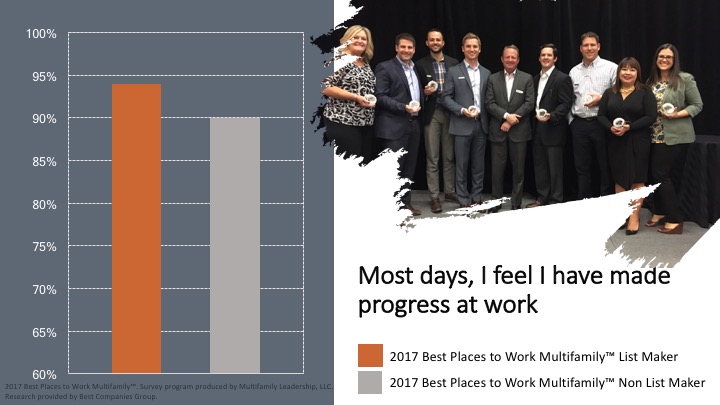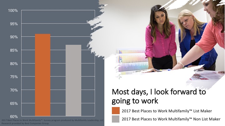 Amongst those that made the list of the Best Places to Work Multifamily™ 91% agree that most days, they look forward to going to work.