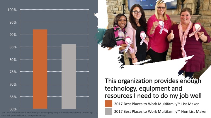 Amongst those that made the list of the Best Places to Work Multifamily™ 92% agree their organization provides enough technology, equipment and resources they need to do their job well.