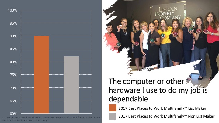 Amongst those that made the list of the Best Places to Work Multifamily™ 90% believe their computer or other hardware they use to do their job is dependable.