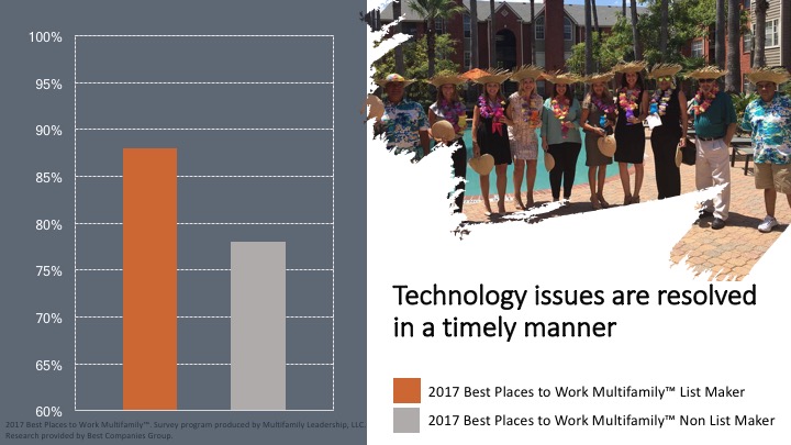Amongst those that made the list of the Best Places to Work Multifamily™ 88% believe technology issues are resolved in a timely manner.