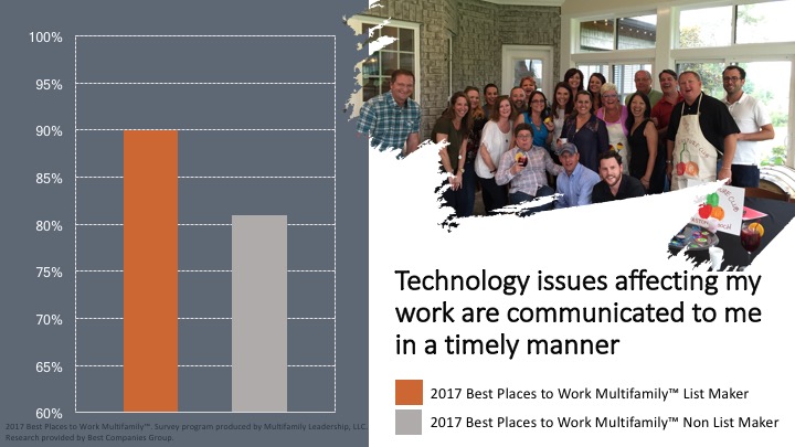 Amongst those that made the list of the Best Places to Work Multifamily™ 90% believe technology issues affecting their work are communicated to them in a timely manner.