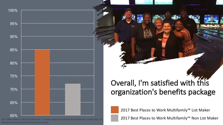Amongst those that made the list of the Best Places to Work Multifamily™ 85% overall, believe they are satisfied with this organization’s benefits package.