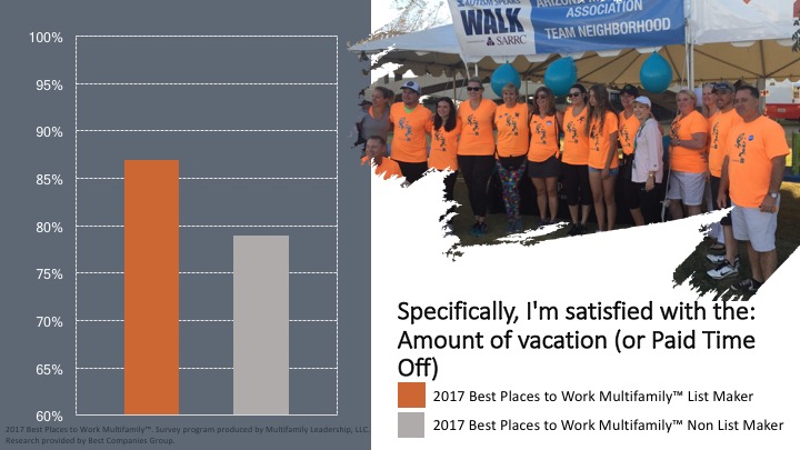 Amongst those that made the list of the Best Places to Work Multifamily™ 87% specifically, believe they are satisfied with the: Amount of vacation (or Paid Time Off).