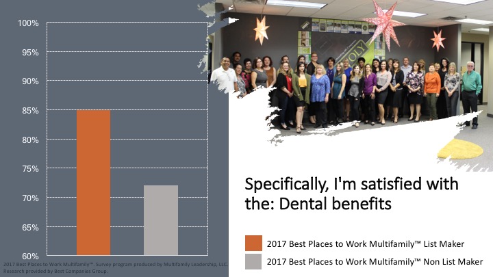 Amongst those that made the list of the Best Places to Work Multifamily™ 85% specifically, believe they are satisfied with the: Dental benefits.