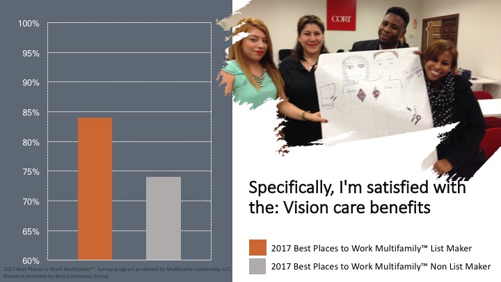 Amongst those that made the list of the Best Places to Work Multifamily™ 84% specifically, believe they are satisfied with the: Vision care benefits.