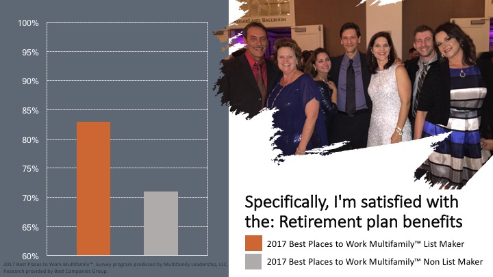 Amongst those that made the list of the Best Places to Work Multifamily™ 83% specifically, believe they are satisfied with the: Retirement plan benefits.