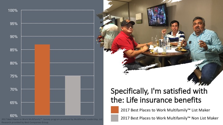 Amongst those that made the list of the Best Places to Work Multifamily™ 87% specifically, believe they are satisfied with the: Life insurance benefits.