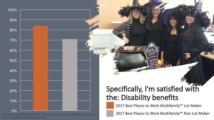 Amongst those that made the list of the Best Places to Work Multifamily™ 84% specifically, believe they are satisfied with the: Disability benefits.