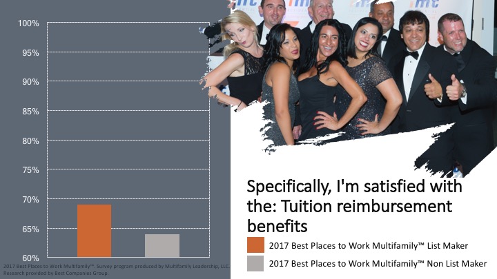 Amongst those that made the list of the Best Places to Work Multifamily™ 69% specifically, believe they are satisfied with the: Tuition reimbursement benefits.
