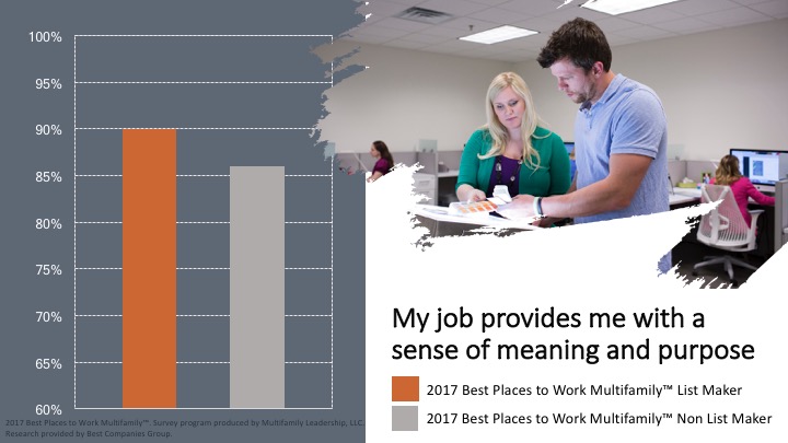 Amongst those that made the list of the Best Places to Work Multifamily™ 90% believe their job provides them with a sense of meaning and purpose.
