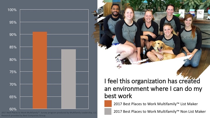 Amongst those that made the list of the Best Places to Work Multifamily™ 91% feel their organization has created an environment where they can do their best work.