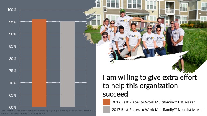 Amongst those that made the list of the Best Places to Work Multifamily™ 96% are willing to give extra effort to help their organization succeed.