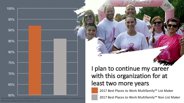 Amongst those that made the list of the Best Places to Work Multifamily™ 92% plan to continue their career with their organization for at least two more years.