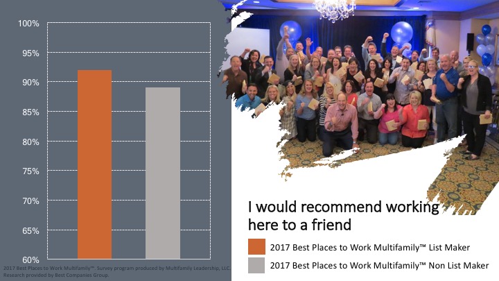 Amongst those that made the list of the Best Places to Work Multifamily™ 92% would recommend working at their company to a friend.